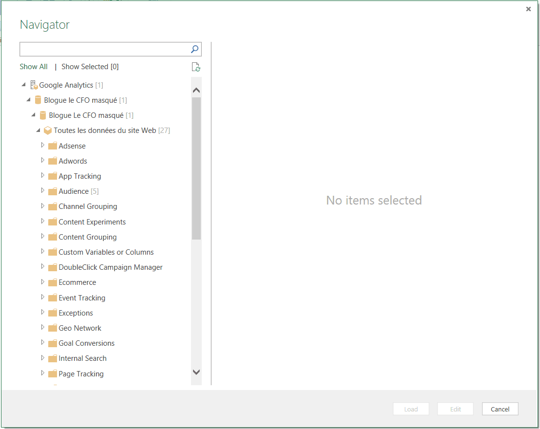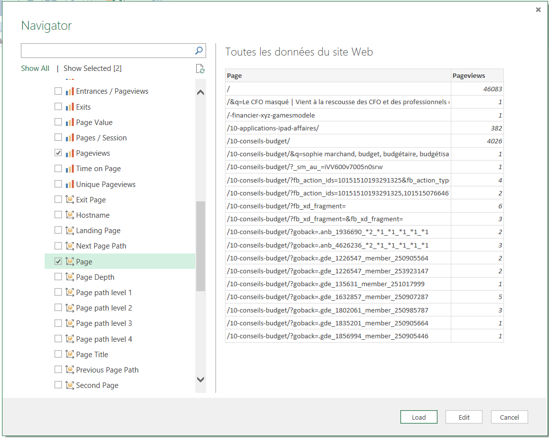 Dans l’exemple ci-bas, je me suis connectée à mon site Google Analytics. Voyez l’étendue des possibilités de données à importer…