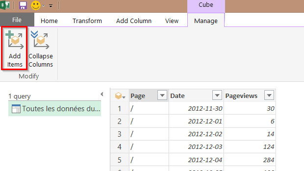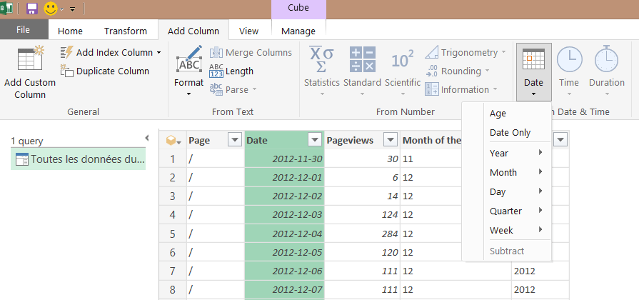 Lorsque l’on fait les importations de données, on retrouve les mêmes menus que dans Power Query (Home, Transform, Add Column, View) avec les mêmes options. Je peux donc ajouter un champ Year, par exemple, même si celui-ci n’était pas présent dans ma base de données sous-jacente, grâce à l’option “Date” du menu “Add Column”.