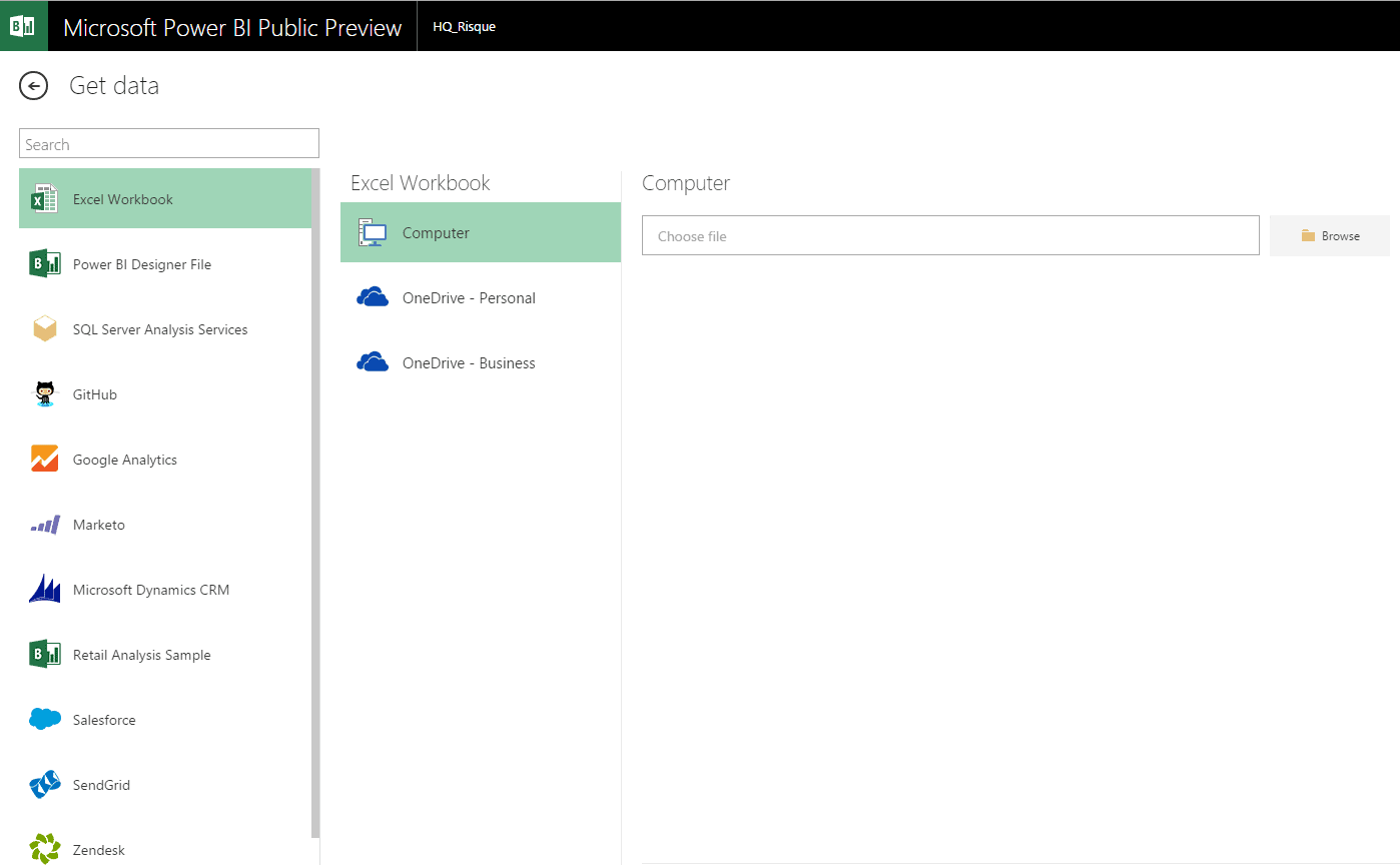 Vous devez d’abord importer des données dans votre interface en ligne. Pour ce faire, vous devez choisir l’option “Get Data”. Vous pourrez aller récupérer un fichier Excel comprenant un modèle de données Power Pivot sur votre ordinateur (ou sur votre OneDrive) ou alors vous approvisionner à différentes sources dont Power BI Designer (nous y reviendrons dans un prochain article), Google Analytics et SalesForce par exemple..