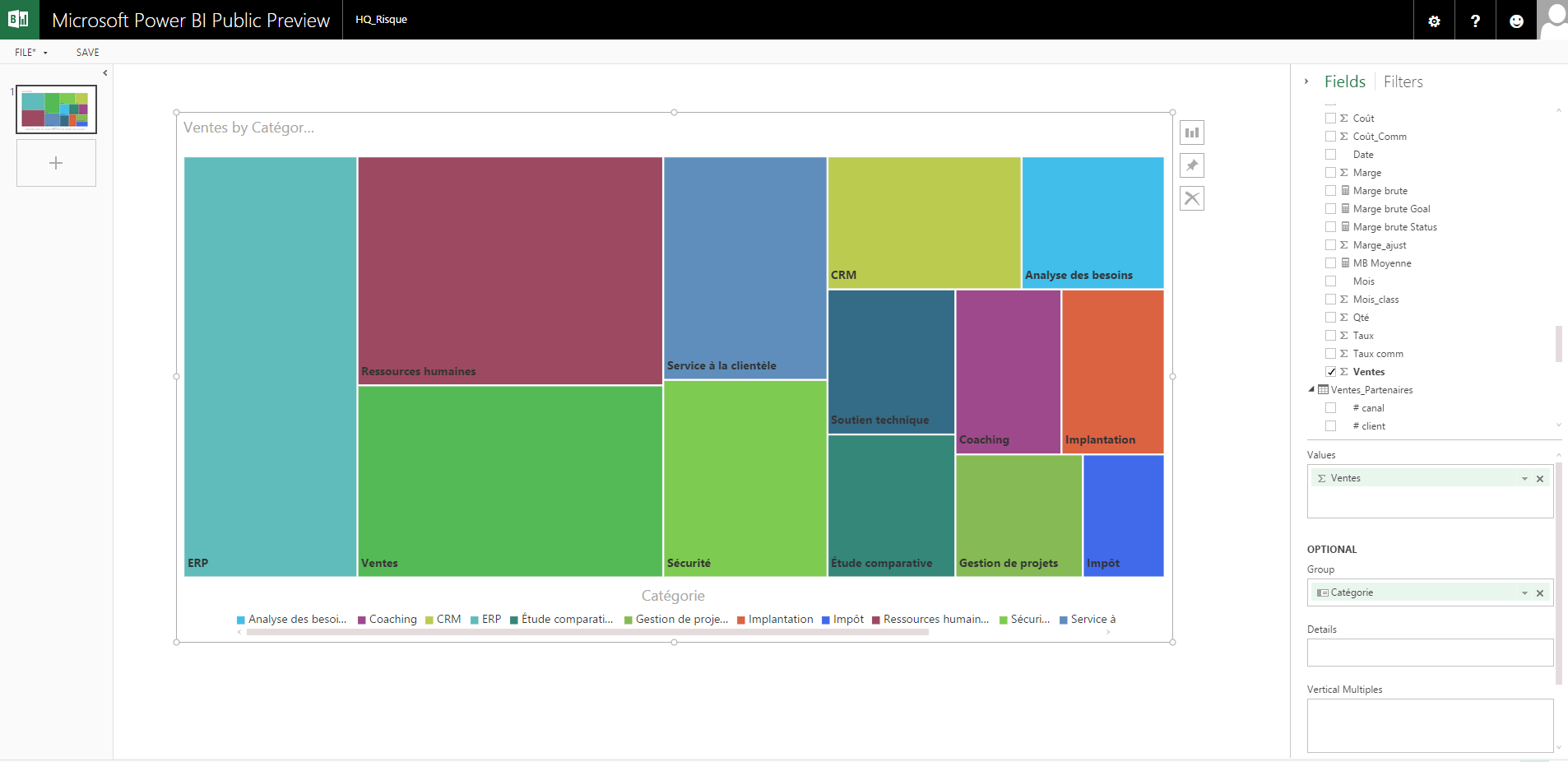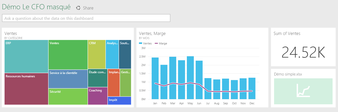 Par exemple, ici, j’utilise le moteur de recherche pour forer dans mes données. Je commence par écrire “Ventes” et l’outil me propose déjà des choix. À noter que les questions doivent être formulées en anglais mais en utilisant les termes du modèle de données sous-jacent (comme dans ce cas-ci, le mot “Ventes”), à moins d’avoir attribuer une taxonomie anglophone à votre modèle de données à travers Power Pivot (nous y reviendrons dans un autre article également).