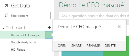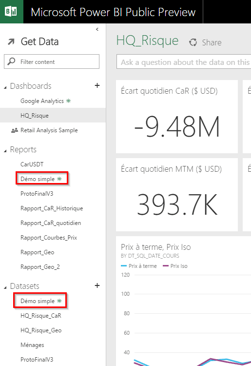 Une fois que vous vous êtes connecté à vos données, vous les verrez apparaître dans la liste des sources de données “Datasets” et dans la liste de vos rapports “Reports”, si vous avez des visualisations Power View. Nous y reviendrons plus tard.