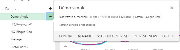 Dans la section “Datasets”, vous retrouvez toutes les visualisations rattachées à une source de données. Vous pourriez toutefois souhaiter les répartir en plusieurs “datasets”. Une fois créé, vous avez également des options pour rafraîchir les données.