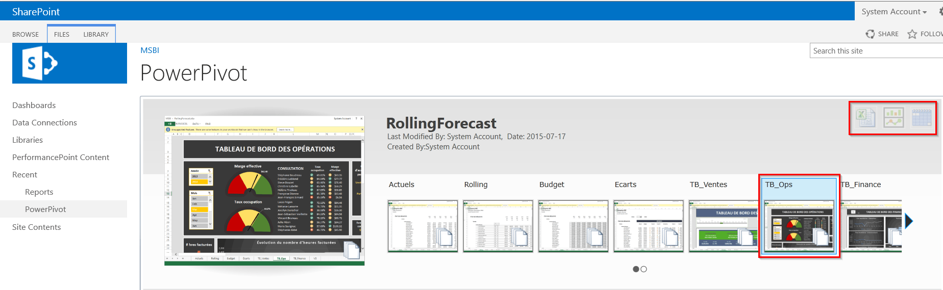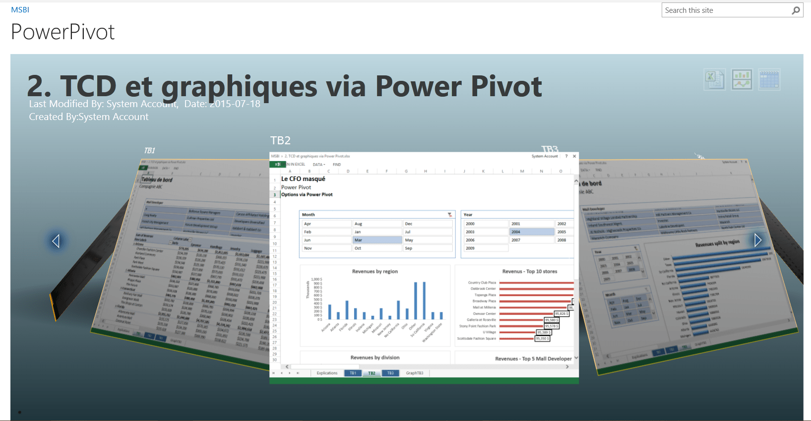 - Naviguer dans la librairie Power Pivot dans Sharepoint pour voir les différents rapports publiés par les membres de votre équipe dans un navigateur sans avoir un Excel local avec les add-ins Power BI.