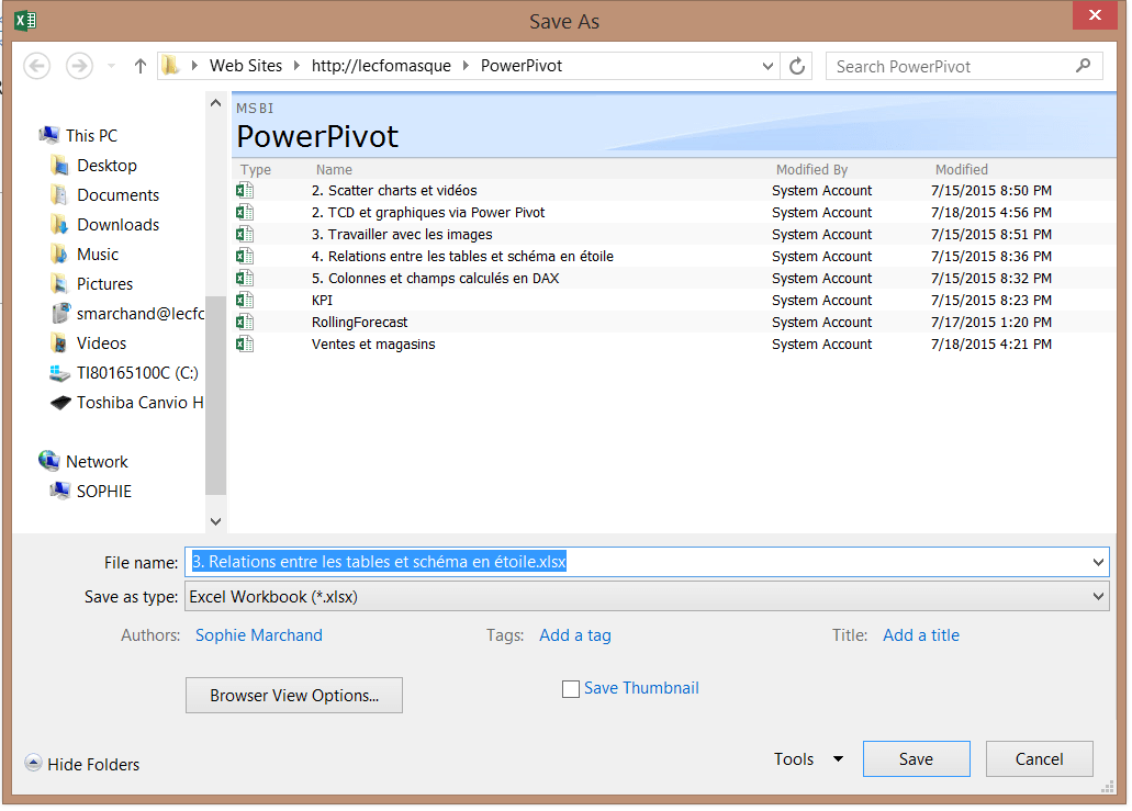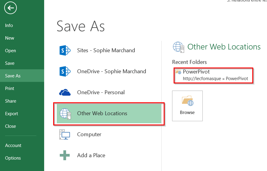 Un fichier Excel contenant un modèle de données Power Pivot peut être publié dans la galerie Power Pivot de Sharepoint via ses options d’enregistrement. Il suffit alors de choisir le lien qui mène vers la galerie Power Pivot dans Sharepoint.