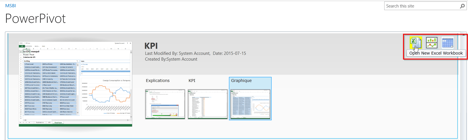 D’abord, vous pouvez connecter un fichier Excel à un modèle de données publié sur Sharepoint, à partir de Sharepoint, via le bouton “Open New Excel Workbook”.