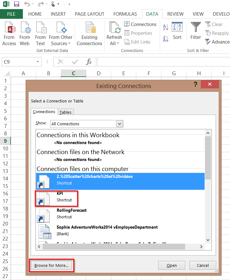 Ensuite, vous pouvez connecter un Excel local à un modèle de données publié sur Sharepoint directement à partir d’un fichier Excel via le menu Data (Données), en choisissant la bonne connection ou en créant une nouvelle connection.