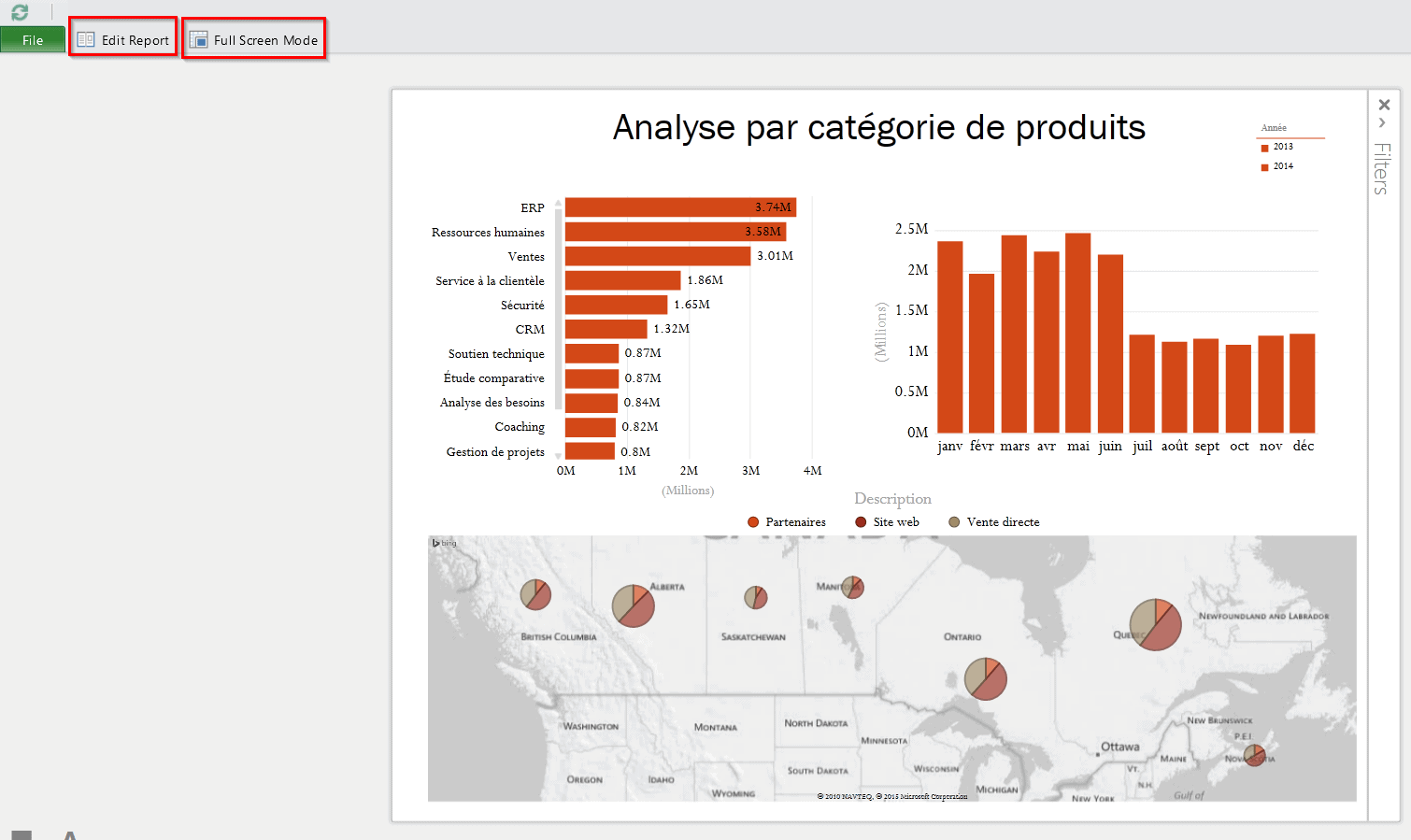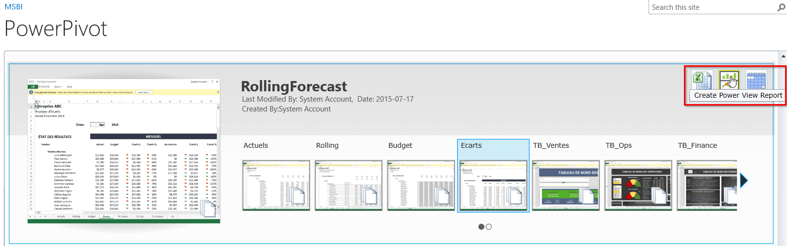 Une fois votre visualisation Power View complétée, vous pouvez l’enregistrer dans votre librairie Power Pivot sur Sharerpoint et celle-ci devient accessible aux autres usagers. Il est aussi possible de voir le rapport en mode plein écran et en mode d’édition.