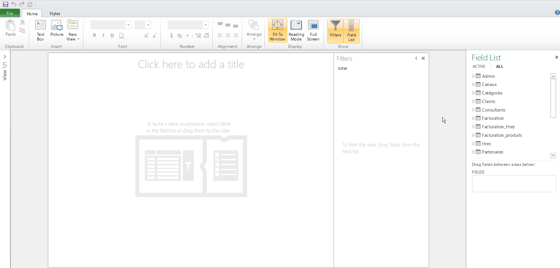Ce faisant, vous ouvrez une fenêtre Power View vierge et vous avez accès à tous les champs du modèle de données. Tous les champs numériques deviennent des champs qui peuvent être utilisés comme mesures.