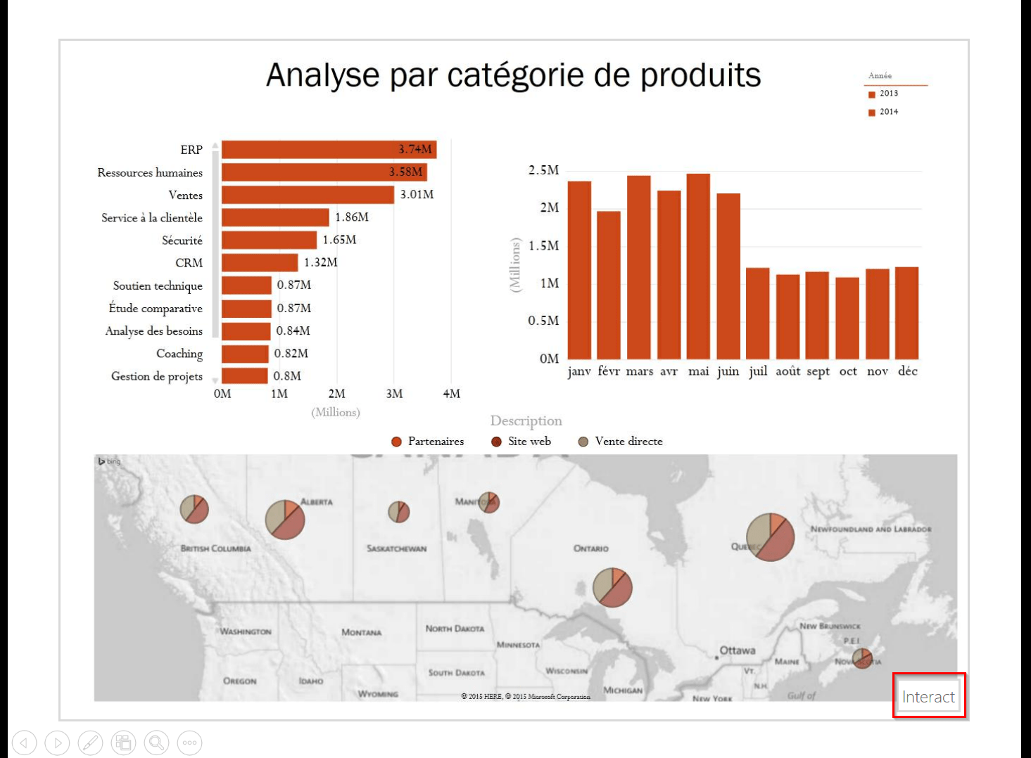 En utilisant l’option “Export to PowerPoint”, vous pouvez insérer une image de votre Power View dans une présentation PowerPoint et en mode présentation, vous pouvez cliquer sur le bouton “Interact” pour interagir avec votre modèle de données et ainsi rendre l’image dynamique. Vous pouvez alors analyser vos données et forer dans celles-ci, lors d’une présentation. C’est une option que j’apprécie particulièrement.