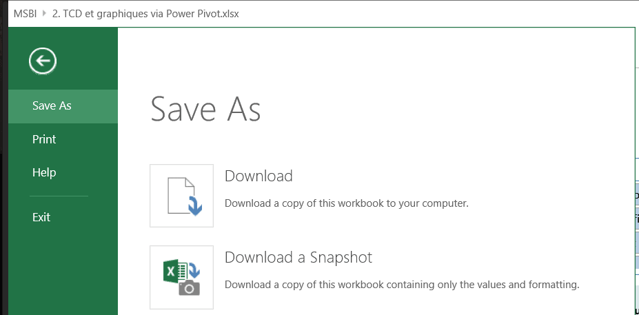 - enregistrer un “snapshot” du fichier (vous n’avez pas besoin d’une version Excel avec Power Pivot pour utiliser cette option).