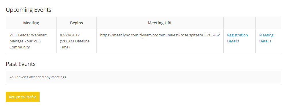 D’abord, vous retrouverez une section sur les rencontres à venir auxquelles vous êtes inscrit. Notez que vous pouvez vous inscrire à des webinaires de groupes variés, en plus des rencontres physiques de votre groupe d’usagers local.
