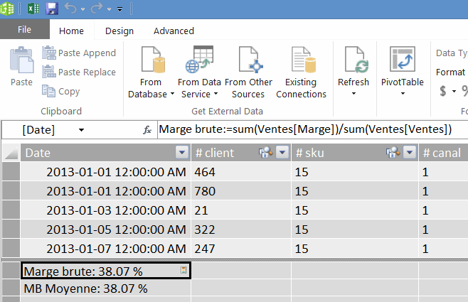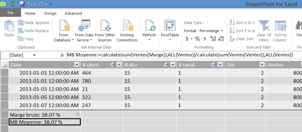 Dans l’exemple ci-dessous, j’ai inséré deux calculs. Le premier est la MB Moyenne, soit la marge brute moyenne. Pour calculer cette marge brute, j’utilise la fonction DAX CALCULATE et la fonction ALL.