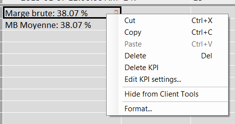 Pour créer un KPI avec Power Pivot concernant notre marge brute, nous avons simplement effectué un clic droit de souris et nous avons choisi l’option Create KPI. Par la suite, il est possible de revenir sur cette option et utiliser Edit KPI settings pour modifier le KPI défini.
