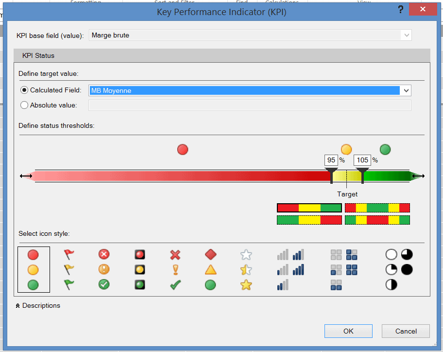 Dans la boîte de dialogue suivante, nous avons indiqué que nous souhaitions créer un KPI basé sur notre calcul de marge brute moyenne, soit notre champ calculé. Nous aurions pu également définir une valeur absolue comme KPI. Ensuite, nous avons décidé qu’une marge brute équivalent à 95% de la marge brute moyenne des ventes était insuffisante (rouge) et qu’une marge brute équivalent à 105% de la marge brute moyenne était largement satisfaisante (vert), tout le reste étant acceptable (jaune).