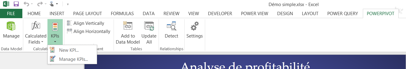 À noter qu’il est également possible de créer, modifier et supprimer des KPIs, directement via le menu Power Pivot de votre fichier Excel.