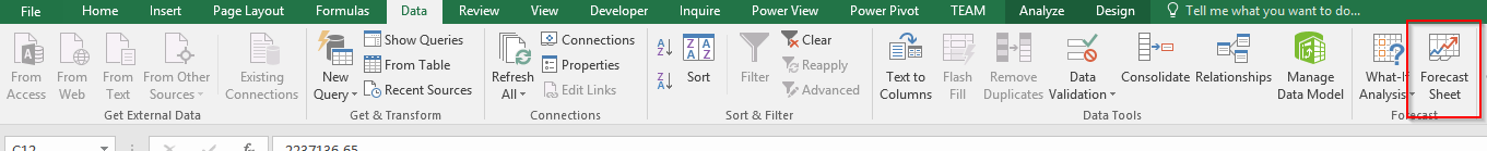 Excel 2016 dispose d’un outil, dans le menu Data (Données), pour effectuer des prévisions. Cet outil se nomme Forecast Sheet.