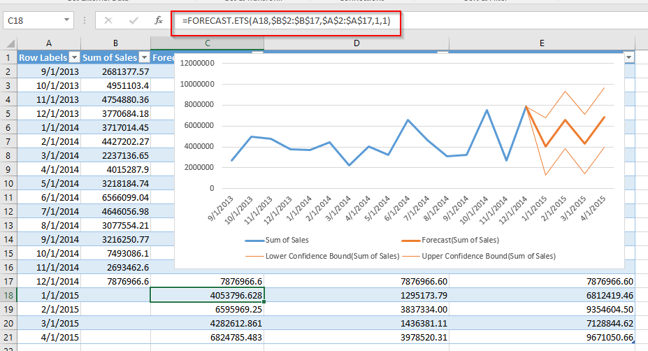 Lorsque vous cliquez sur Create, vous obtenez un graphique et un tableau de données avec les prévisions. Ce tableau utilise une nouvelle fonction FORECAST. ETS.