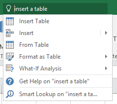 Si vous sélectionnez l’une d’entre elles, par exemple Insert a table, Excel vous donne accès à différents menus qui pourraient vous aider à faire ce que vous souhaitez faire.