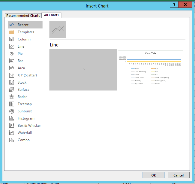 Une autre nouveauté digne de mention, c’est qu’Excel dispose désormais de plus d’options de graphiques. Dans l’image ci-bas, vous pouvez apercevoir, à la fin de la liste, de tout nouveaux graphiques.