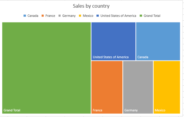 Ci-bas, j’ai utilisé le graphique Treemap pour représenter les ventes par pays.