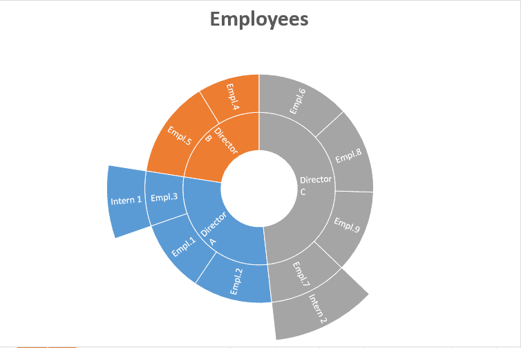 Ci-bas, j’ai utilisé le graphique Sunburst pour représenter une hiérarchie d’employés: Directeurs / Employés réguliers / Stagiaires.