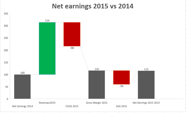 Il a toujours été difficle (mais possible) de créer des graphiques Waterfall dans Excel. À ce sujet, vous pouvez relire l’article: Les graphiques en cascades pour expliquer les écarts. Maintenant, avec Excel 2016, cet exercice est devenu très simple. Ci-bas, j’ai dessiné un graphique qui explique les écarts entre le bénéfice net de 2014 et celui de 2015.