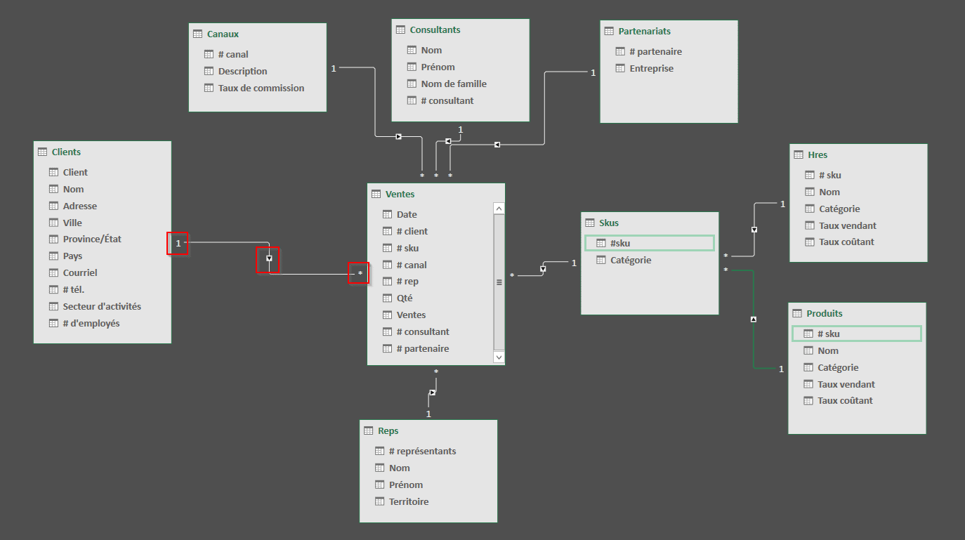 De façon générale, l’interface est plus conviviale. La barre de formules utilise notamment différentes couleurs pour différencier les différentes portions d’une formule. De plus, lorsque l’on crée une relation entre deux tables, Power Pivot nous indique par un 1 ou par un * si la table en question possède une seule fois chaque élément de la clé commune ou si elle possède des doublons. De plus, le sens de la direction de la relation est indiqué.