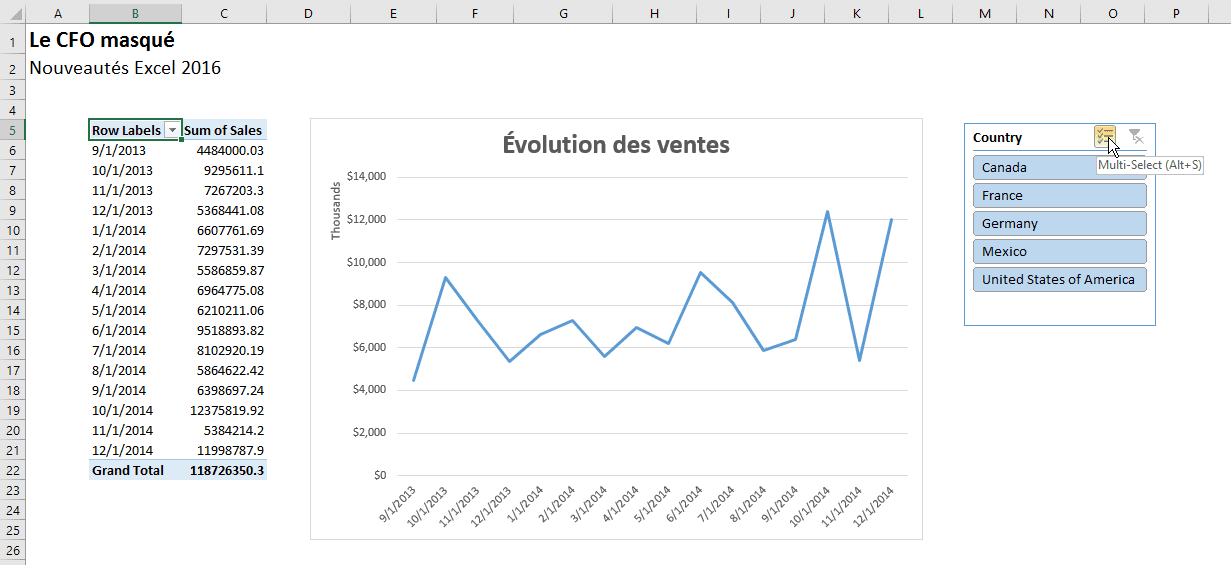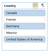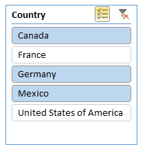 Si vous n’avez pas fait de choix dans le segment et que vous cliquez sur le bouton Multi-Select, tout ce que vous cliquerez par la suite sera désactivé. Ci-bas, j’ai cliqué sur France et sur Mexico, ce qui a désactivé ces options. Le filtre s’appliquera donc à Canada, Germany et United States of America.