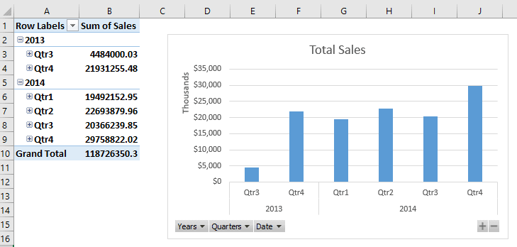 Excel 2013 permet de forer dans un graphique conçu à partir d’un champ représentant une hiérarchie. Je vous ai montré comment dans l’article suivant: Comment et pourquoi créer des hiérarchies dans Power Pivot. Avec Excel 2016, la navigation d’un niveau à un autre se fait de façon plus fluide, à même le graphique, grâce aux nouveaux boutons, que vous pouvez voir en bas du graphique, à droite.