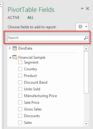 La liste de champs d’un tableau croisé dynamique, en Excel 2016, dispose d’un menu de recherche. Ceci peut être largement utile, notamment lorsque vous travaillez avec des modèles de données volumineux.