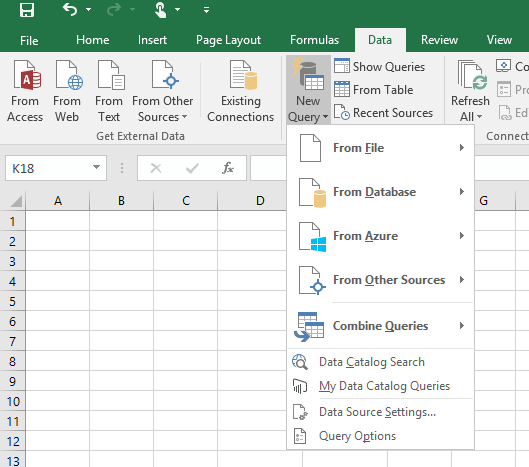 Power Query n’a pas tellement changé outre le fait qu’il ne s’appelle plus Power Query et qu’il n’est plus un add-in mais qu’il occupe plutôt une section du menu Data (Données), tel qu’illustré ci-dessous.