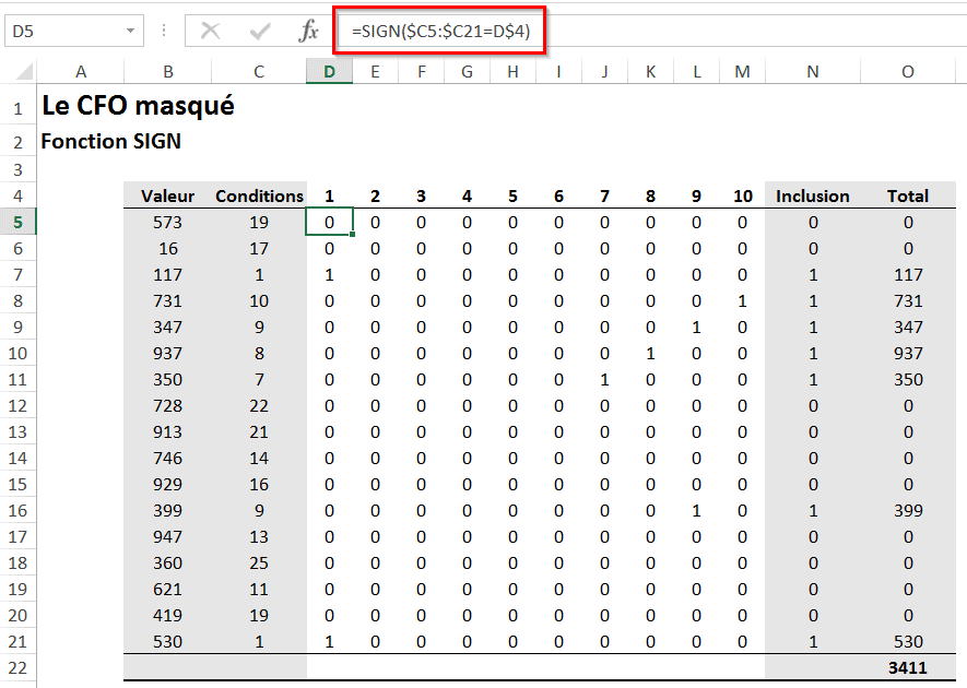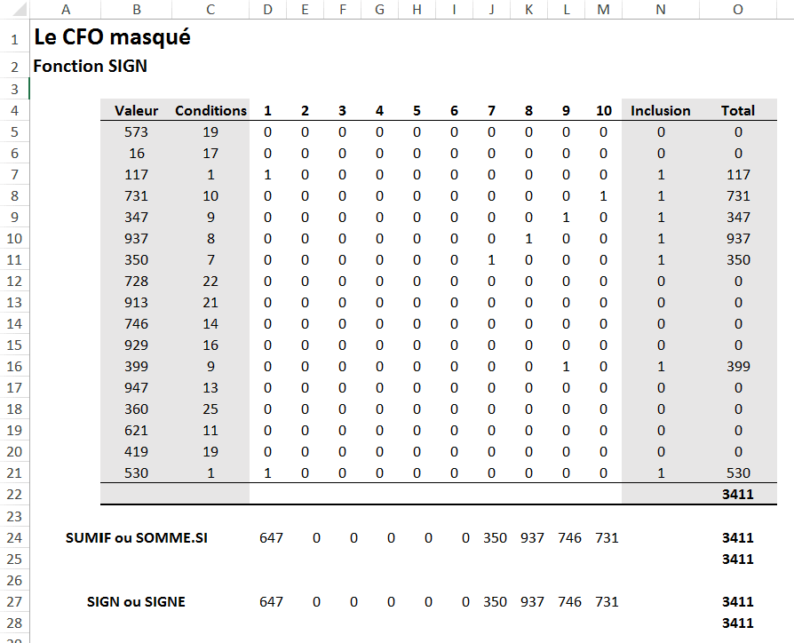 Il faut voir l’application de la formule ci-dessus comme un tableau de conditions (illustré ci-bas). Attention! Pour utiliser la fonction SIGN ou SIGNE, vous n’avez pas à reproduire ce tableau. Celui-ci explique simplement la mécanique derrière cette fonction. La fonction SIGN($C5:$C21=D$4), ci-bas, ramène un 0 ou un 1 selon que la condition sous-jacente est respectée ou non. Ainsi, pour toutes les conditions égales à 1, on aperçoit un 1 dans la colonne D et pour toutes les autres conditions, on aperçoit un 0. De même, dans la colonne J, pour toutes les conditions égales à 7, on aperçoit un 1 et pour toutes les autres conditions, on aperçoit un 0. Il en va de même pour chacune des colonnes D à M.