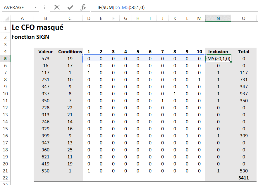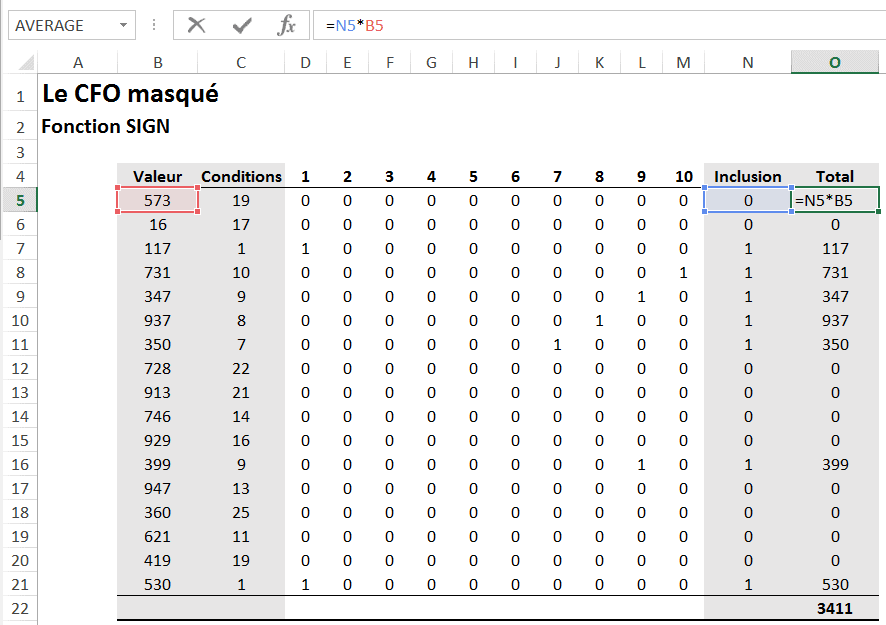 Ensuite pour obtenir la valeur totale, on pourra simplement multiplier les 1 et les 0 de la colonne N par les valeurs de la colonne B.