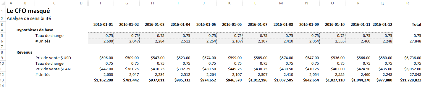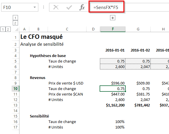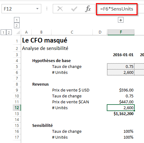 Dans l’exemple suivant, je calcule des revenus en $CAN à partir d’un prix de vente unitaire en $USD, un taux de change et un nombre d’unités. Vous remarquerez que les informations concernant le taux de change et les unités sont présentées dans une section distincte, intitulée Hypothèses de base, puisqu’il s’agit d’hypothèses et que j’aimerais effectuer une analyse de sensibilité éventuellement sur ces hypothèses.