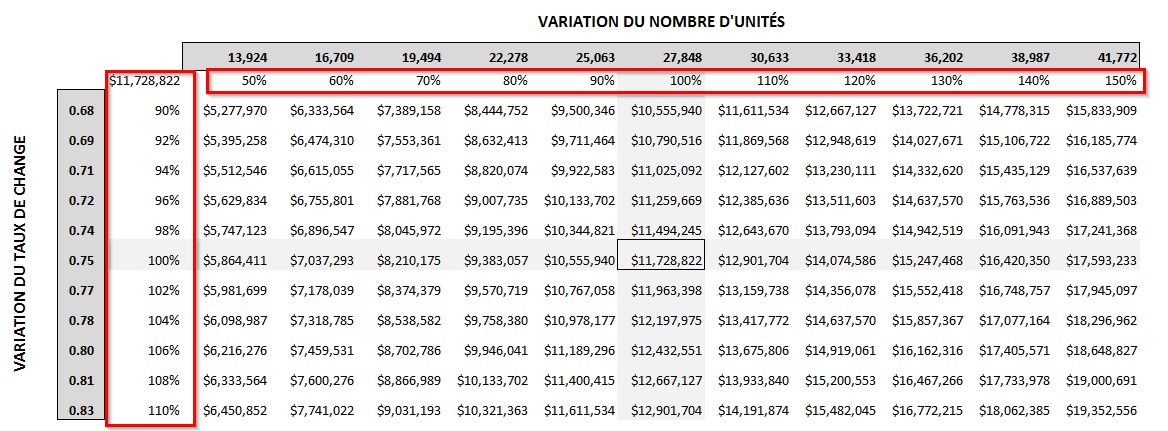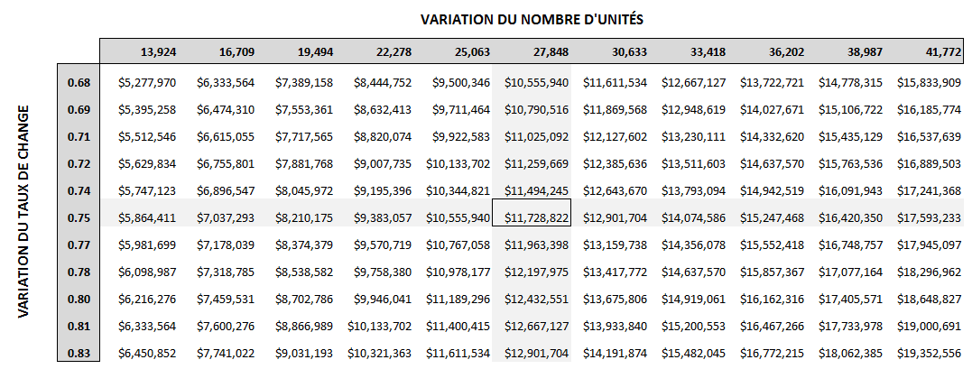 Je peux donc créer une table de sensibilité sur mes revenus, en faisant varier le taux de change et le nombre d’unités. Lorsque mes hypothèses sont respectées à 100%, i.e. lorsque mon taux de change est à 0.75 et que mon nombre d’unités vendues est à 27,848, mes revenus en $CAN sont de 11,728,822. Par contre, lorsque le taux de change passe à 0.68 (et que le nombre d’unités demeure stable), les revenus baissent à 10,555,940 et lorsque le taux de change demeure stable et que le nombre d’unités passe à 13,924, les revenus baissent à 5,864,411. Et lorsqu’ à la fois le taux de change passe à 0.68 et le nombre d’unités à 13,924, les revenus passent à 5,277,970. Cette table de sensibilité nous renseigne donc sur le potentiel de risque et d’opportunité de notre entreprise, au niveau des revenus.