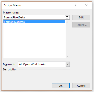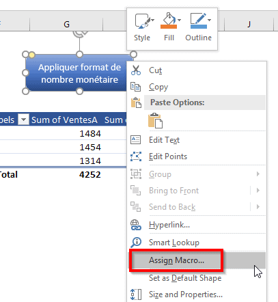 Je peux insérer le texte “Appliquer format de nombre monétaire” à ce nouveau bouton. Ensuite, avec un clic droit de souris, je peux choisir Assign Macro (Assigner une macro).
