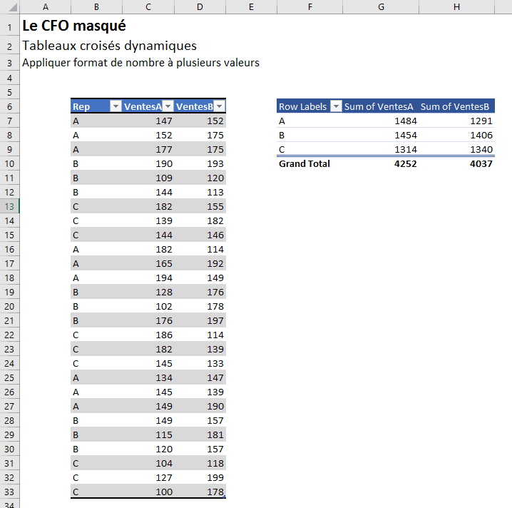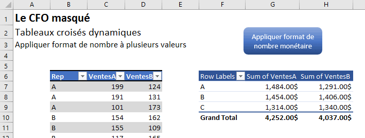 Par la suite, chaque fois que je cliquerai sur ce bouton, toutes les valeurs de tous les tableaux croisés dynamiques de mon fichier seront transformées en format de nombre monétaire. Bien sûr, par la suite, je pourrai également revenir sur certaines valeurs et changer à nouveau leur format pour un format autre que monétaire.