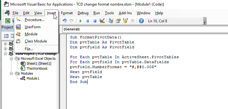 En supposant, à présent, que je veuille appliquer un format monétaire à l’ensemble des valeurs de mon tableau croisé dynamique, ici les VentesA et VentesB, je dois ouvrir l’éditeur VBA (Alt+F11) et cliquer sur Insert Module (Insérer un module).