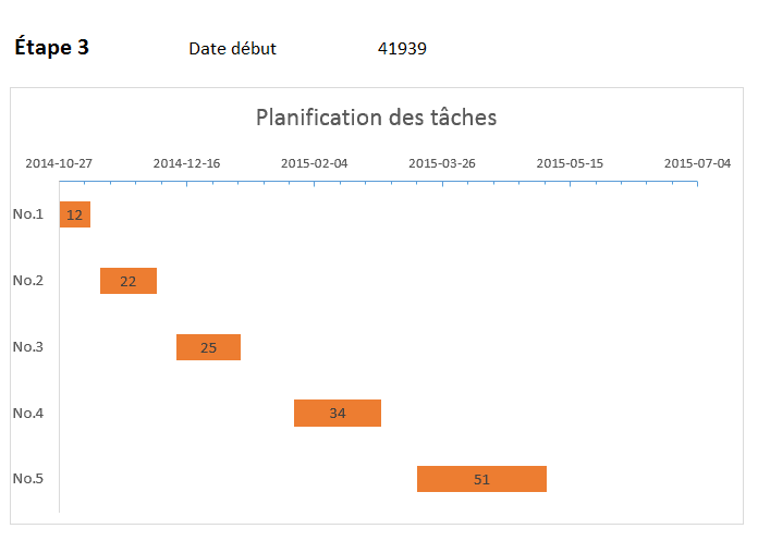 Normalement, un projet est divisé en phases (souvent intimement liées aux tâches à effectuer). La plupart du temps, on connaît la date à laquelle on va débuter la première phase. Dans notre exemple ci-bas, cette date est le 27 octobre 2014. Ensuite, il s’agit de définir, dans l’ordre chronologique ascendant, la séquence de phases du projet. On doit également déterminer combien de jours (ou d’heures) devrait exiger chacune des phases. Comme la plupart des projets se déroulent lors des jours de travail, on doit souvent utiliser une formule pour exclure les journées de week-end et les vancances (et autres jours fériés). Pour cela, on utilisera la fonction Workday ou Serie.jour.ouvre en français.