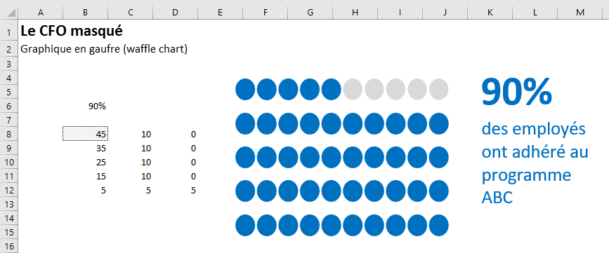 D’abord, il faut vous assurer de bien comprendre vos données et de savoir comment vous souhaitez construire votre gaufre. Par exemple, ci-dessous, je désire dessiner une gaufre avec 10 éléments par ligne (largeur) et 5 éléments par colonne (hauteur). Au total, j’obtiendrai donc une gaufre de 10*5 éléments, i.e. 50 éléments. Si la valeur que je souhaite représenter est 90%, je devrai donc utiliser 45 comme valeur d’entrée dans ma gaufre. J’insère donc la valeur 45 dans la cellule B8. Dans la colonne C, j’ai une formule qui prend le minimum entre 10 (le nombre maximum d’éléments d’une ligne) et la valeur correspondante dans la colonne B. Les valeurs de la colonne B sont obtenues en soustrayant la valeur de la colonne C de la ligne précédente de la valeur de la colonne B de la ligne précédente. Autrement dit, on alloue les 45 points entre les 50 éléments disponibles et ce, ligne par ligne. En B12, on retrouve donc la valeur 5 (15-10) et en C12, on retrouve la valeur 5 (minimum entre 10 et 5). C’est ce qui permet d’afficher les 5 cercles bleus dans la gaufre. Dans la colonne D, on retrouve les valeurs nécessaires pour les cercles gris. On fait donc seulement la différence entre 10 et la valeur de la colonne C. C’est pourquoi on obtient la valeur 5 en D12, qui représente les 5 cercles gris de la gaufre.
