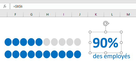 J’ai ensuite ajouté une zone de texte, que j’ai liée à ma cellule qui comprend le % à afficher et j’ai ajouté une deuxième zone de texte pour présenter le texte correspondant.