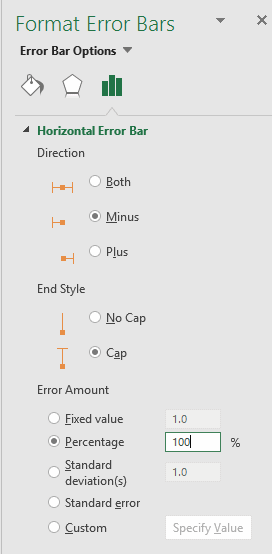 Choisissez ensuite la barre d’erreurs pour les X et cliquez sur MINUS/MOINS, puis fixez le % à 100%.