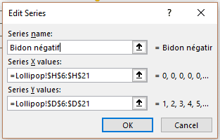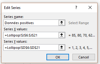Pour construire un graphique lollipop dans Excel, il s’agit d’abord de tracer un graphique en nuage de points avec la série de données positives.