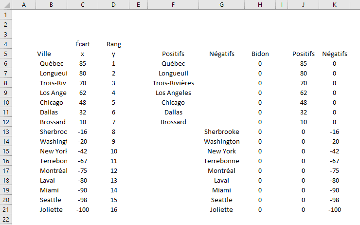 Voici les données avec lesquelles nous allons travailler. À noter que les colonnes F à K sont calculées à l’aide de formules SI. Nous verrons plus tard, que nous pouvons éviter les 0 dans les séries, en séparant les données en deux ensembles de données de différentes volumétries. Toutefois, si vous souhaitez mettre en place une mécanique automatisée, la procédure suivante vous permettra d’arriver à vos fins, sans l’utilisation de VBA ou de Power Query.