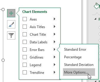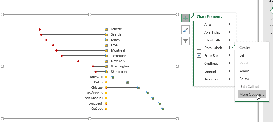 Pour insérer les lignes, ajoutez des barres d’erreurs. Choisissez l’option MORE OPTIONS/PLUS D’OPTIONS.