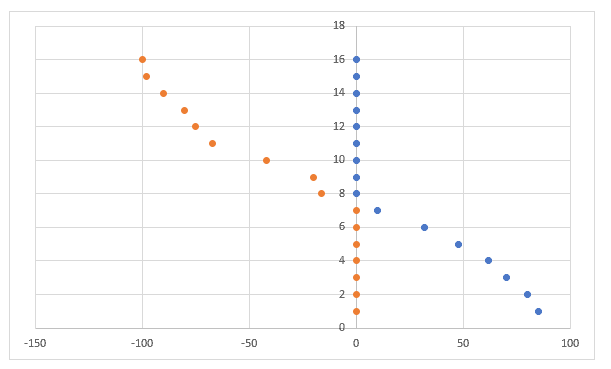Afin de positionner les titres de l’axe des Y à droite ou à gauche de l’axe, selon que les données soient positives ou négatives, créez des séries de données bidons, comme suit: