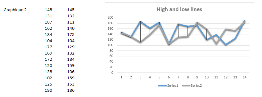 Voici maintenant le résultat de l’ajout de Drop Lines / Lignes de connexion sur un graphique en ligne avec 2 séries de données.