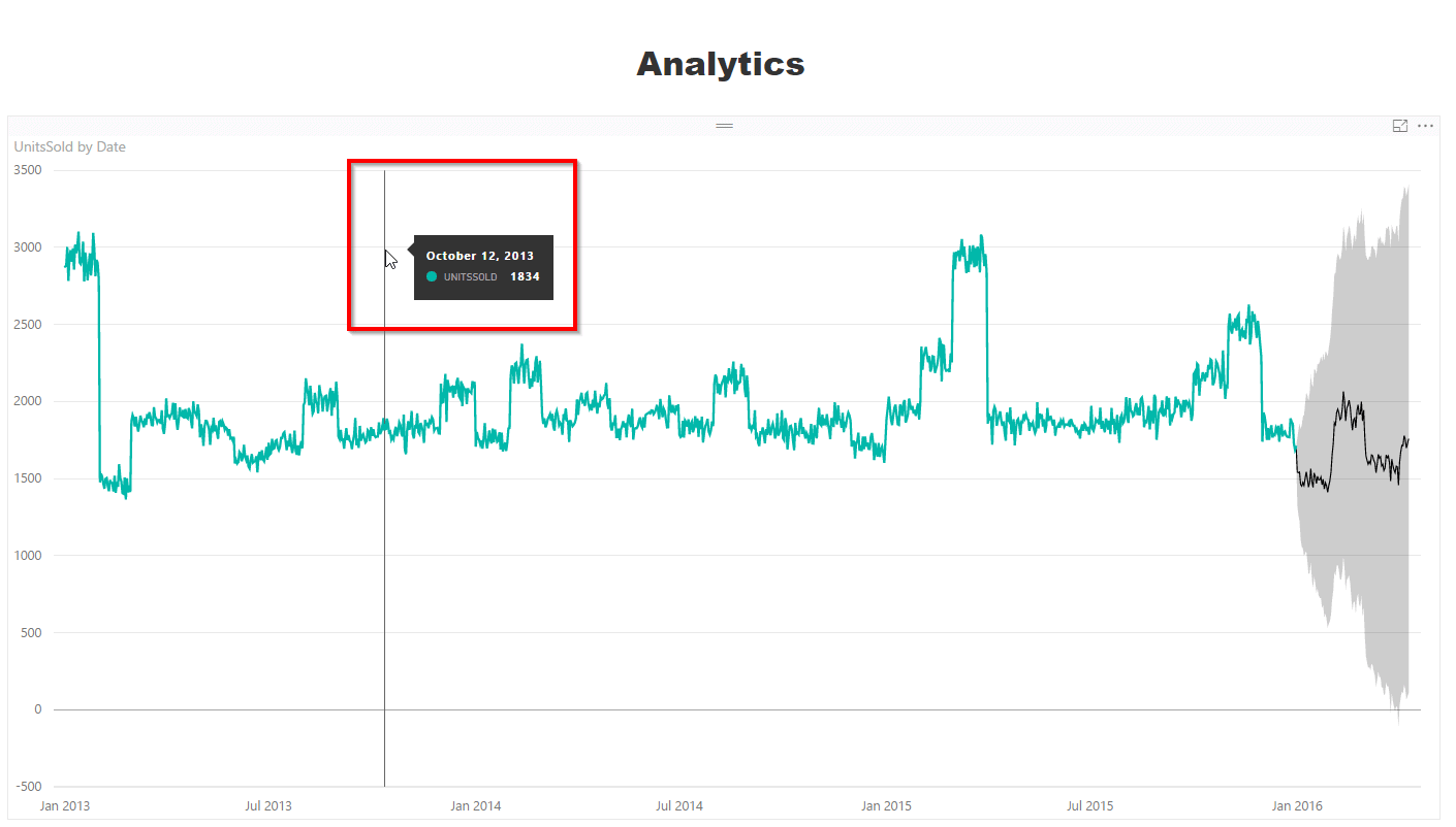 Dans Power BI, lorsque vous créez un graphique en ligne (courbe), automatiquement, vous pouvez positionner votre curseur sur un point de la courbe et voir une ligne, qui descend jusqu’à la valeur correspondante sur l’axe des X, tel qu’illustré ci-dessous.