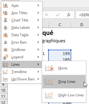 Dans les options disponibles via le bouton +, il y a des Up/Down Bars (Barres vers le haut et vers le bas) mais il n’y a pas de Drop Lines (lignes de connexion), qui elles, sont seulement disponibles à partir du menu Design/Création, plus précisément dans les choix du menu Add Chart Element / Ajouter un élément graphique sous Lines/Lignes.
