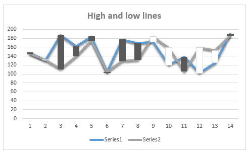 L’option Up/Down Bars (Barres vers le haut et le bas) donne plutôt le résultat suivant, qui n’est pas non plus dépourvu d’intérêt, au contraire, puisqu’il permet de comparer l’étendu de l’écart et le sens des écarts entre les 2 séries de données. En effet, ici on voit que lorsque l’écart est positif en faveur de la série en bleu, la barre est grise foncée et lorsque l’écart est positif en faveur de la série en gris, la barre est blanche.